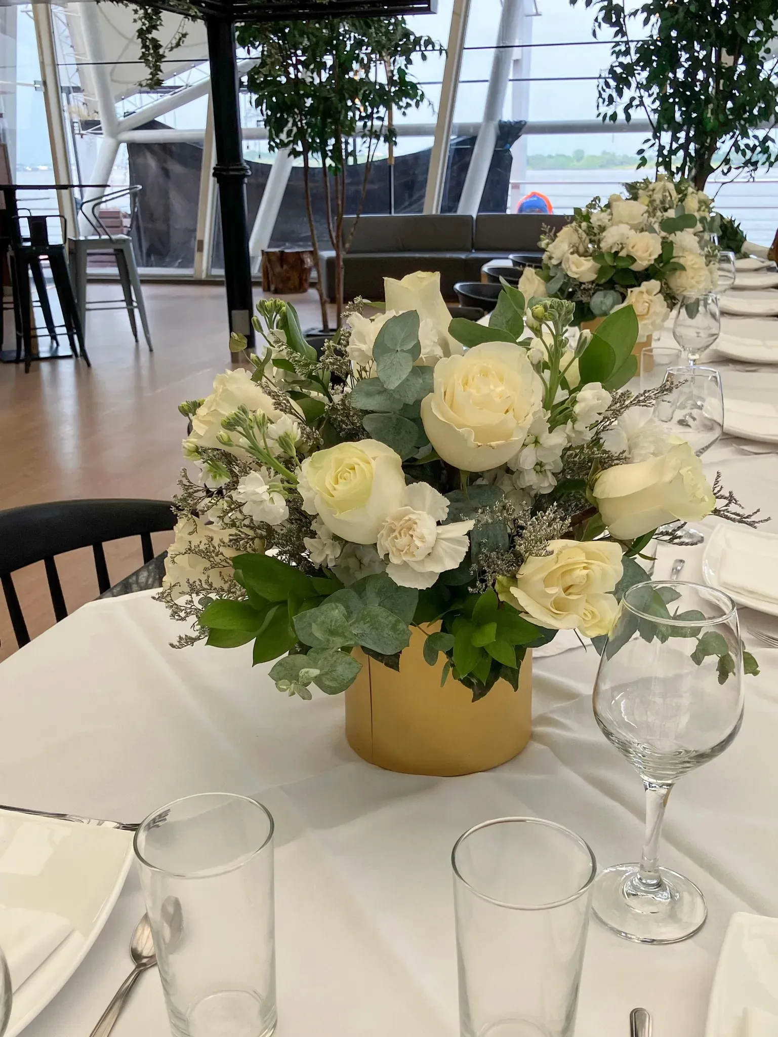 Un refinado centro de mesa diseñado para aportar elegancia y calidez a la recepción de boda. Dispuesto sobre una base delicada, este arreglo combina flores frescas en tonos suaves, con toques de follaje verde que aportan textura y movimiento.