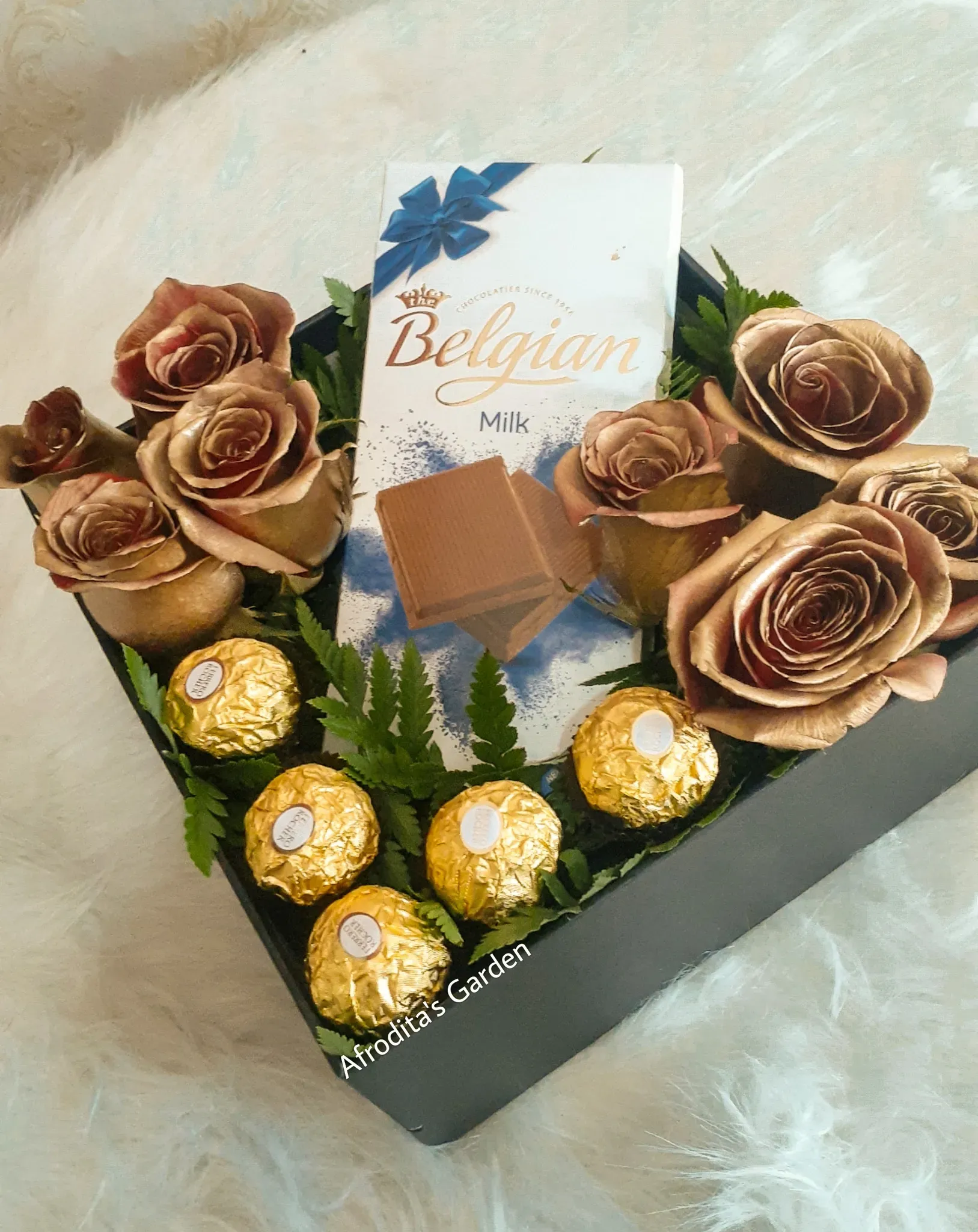 Un detalle que combina sofisticación, dulzura y belleza natural. Este exquisito arreglo reúne finos chocolates, majestuosas rosas doradas y el toque verde del helecho cuero, creando una armonía visual y sensorial que transmite distinción y aprecio. Ideal para ocasiones especiales donde se quiere dej...