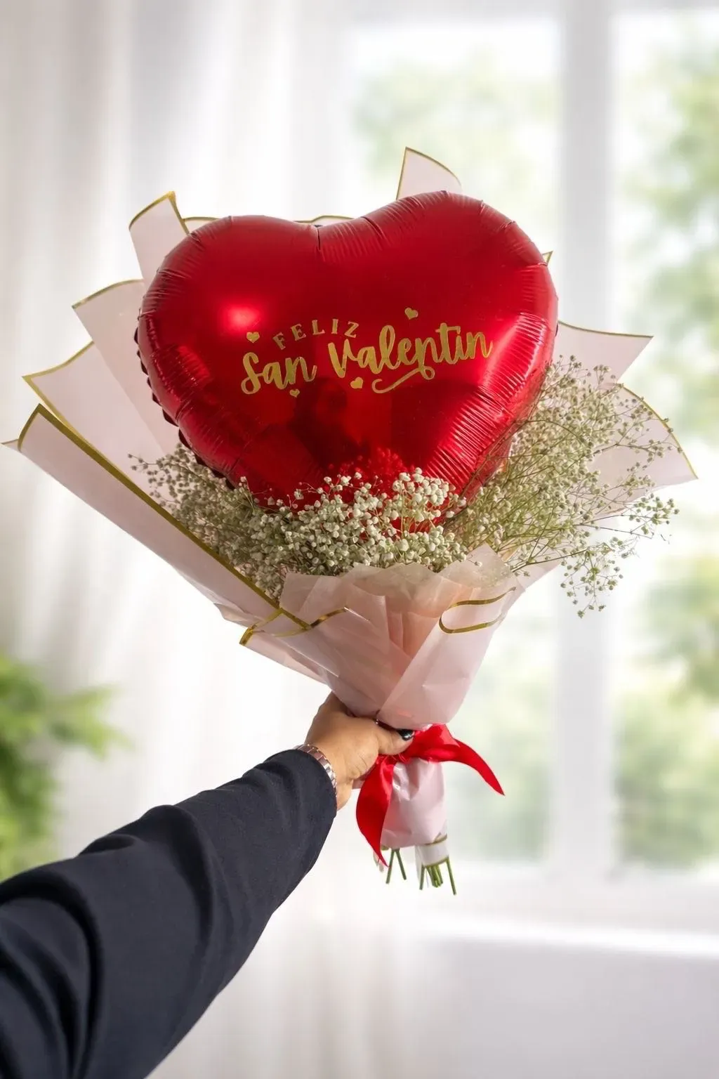 Composición de flores surtidas en tonos suaves, acompañada de un globo de corazón con frase personalizada. Un regalo romántico y lleno de encanto.